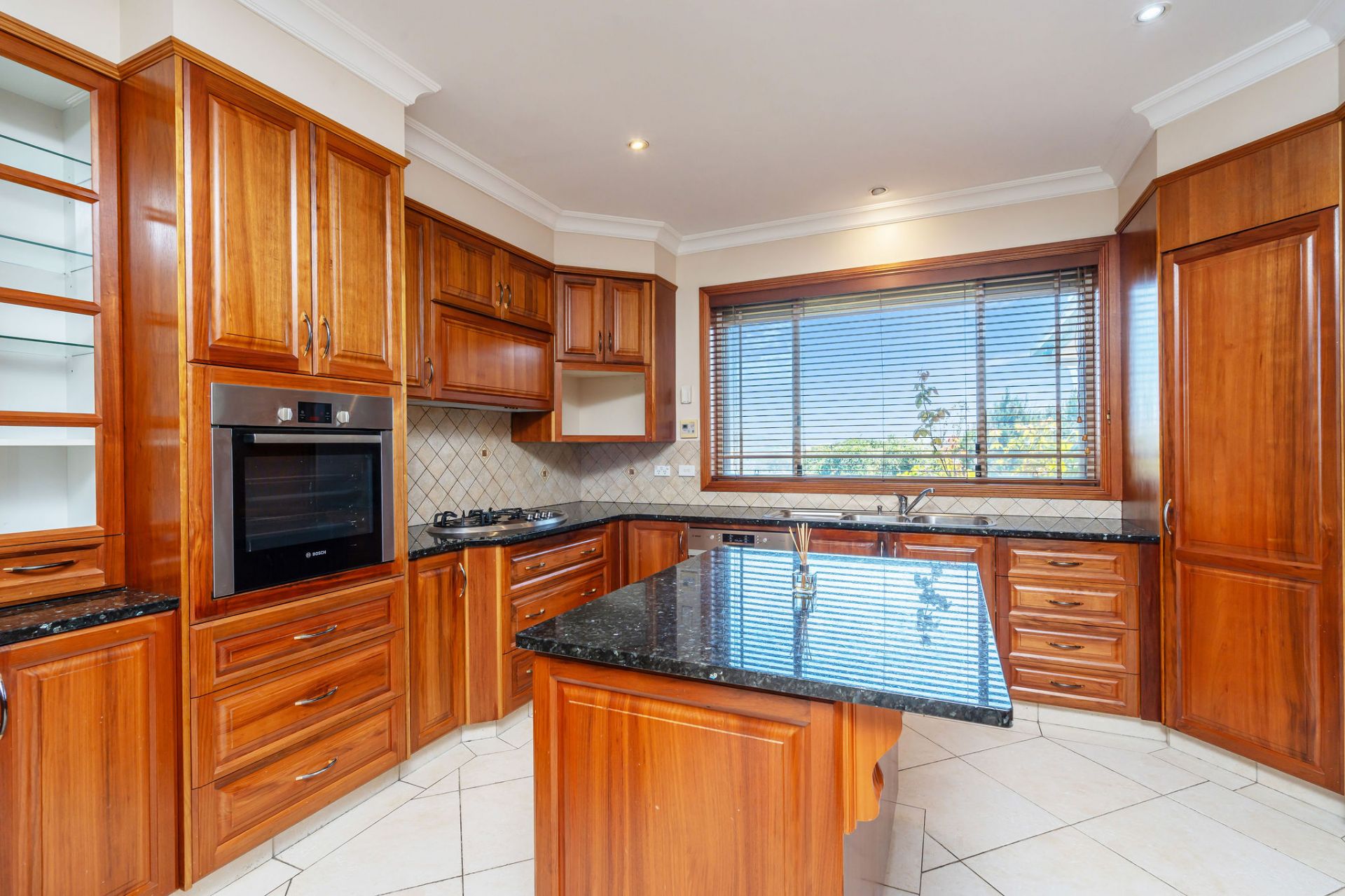 The kitchen which is the centre piece of the home is also appointed with solid Tasmanian blackwood and granite benchtops. Other features include gas cooktop, integrated dishwasher, walk-in pantry and corner pantry, plentiful cupboards and pot and pan drawers. The kitchen forms part of the open plan family living precinct. With a slow combustion fireplace and bay windows giving access for natural light and views to the extensive gardens.